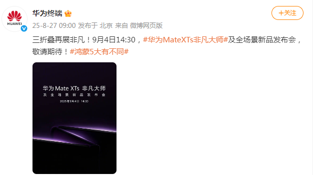8月27日配资股票,华为终端微博发文称:三折叠再展非凡!9月4日14:30,华为MateXTs非凡大师及全场景新品发布会,敬请期待!