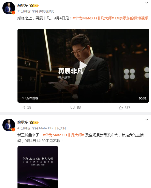 随后,华为常务董事、终端BG董事长余承东连发两条微博表示:“新三折叠来了!华为MateXTs非凡大师9月4日14:30不见不散。”